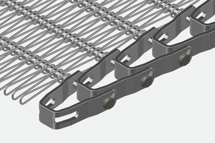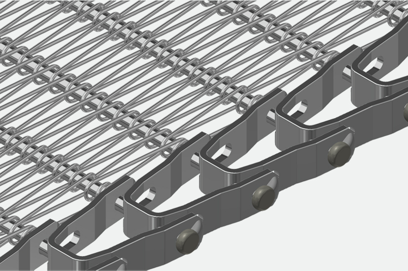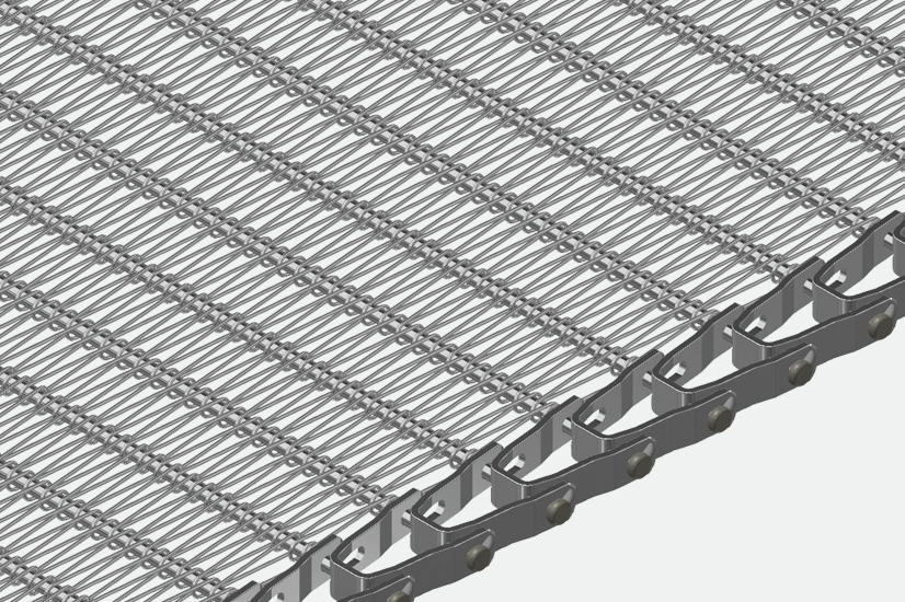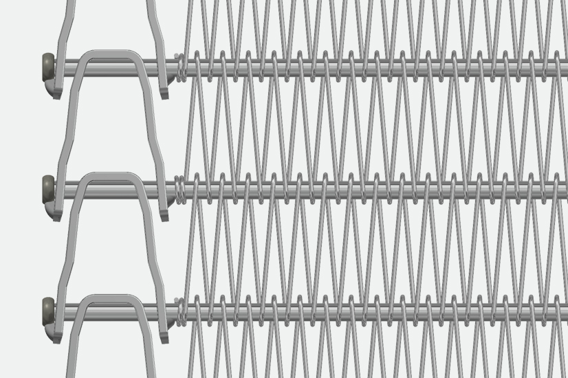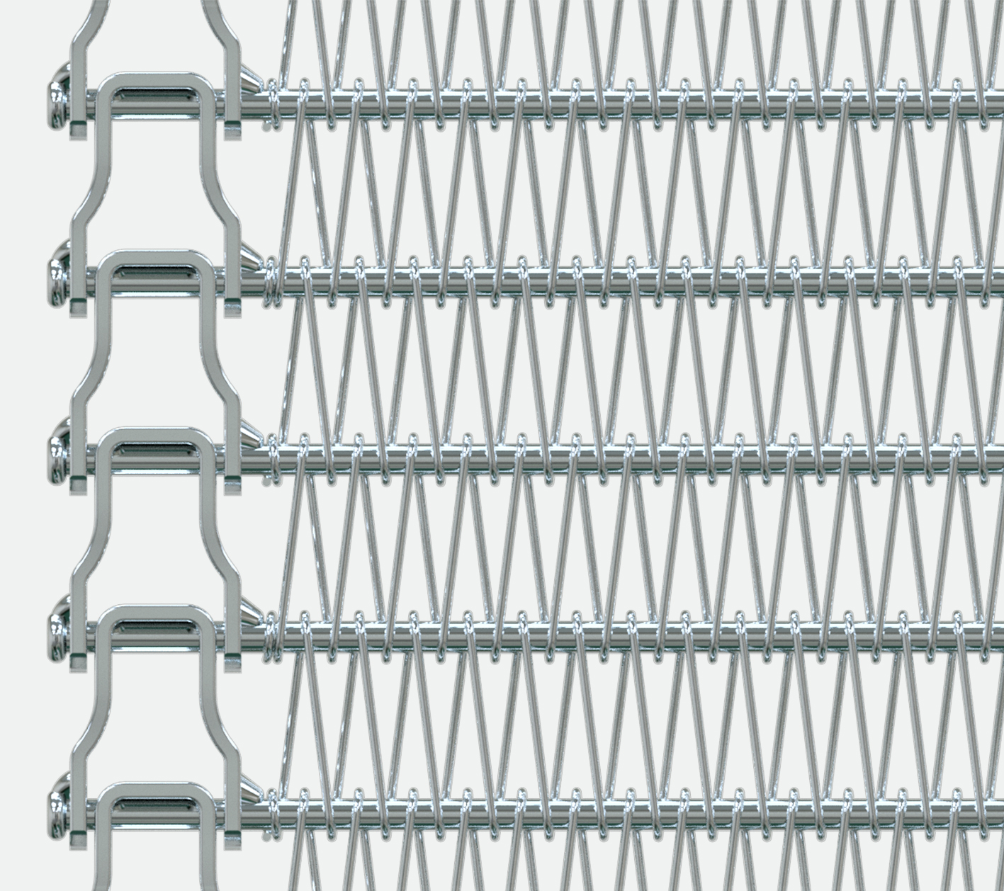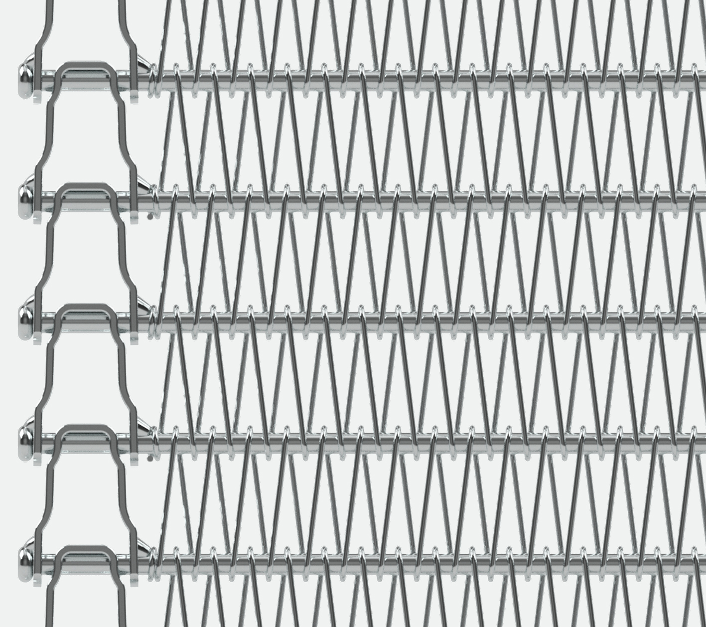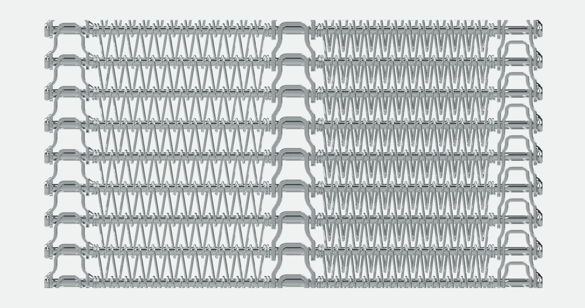 Le tapis transporteur VICO-Flex est composé de spires reliées par des tringles droites. Ils présentent des maillons spéciaux sur les bords constitués d’éléments en « U » avec un profil spécialement conçu pour pouvoir obtenir une flexibilité importante du tapis dans toutes les directions.