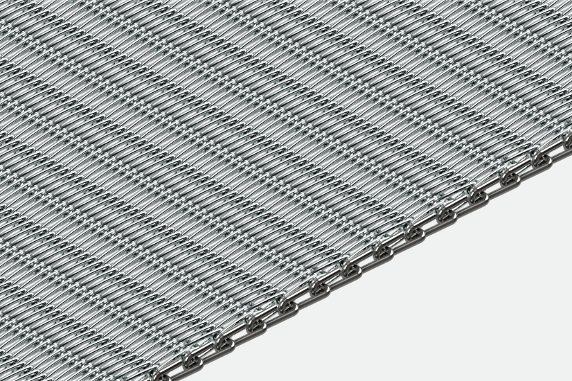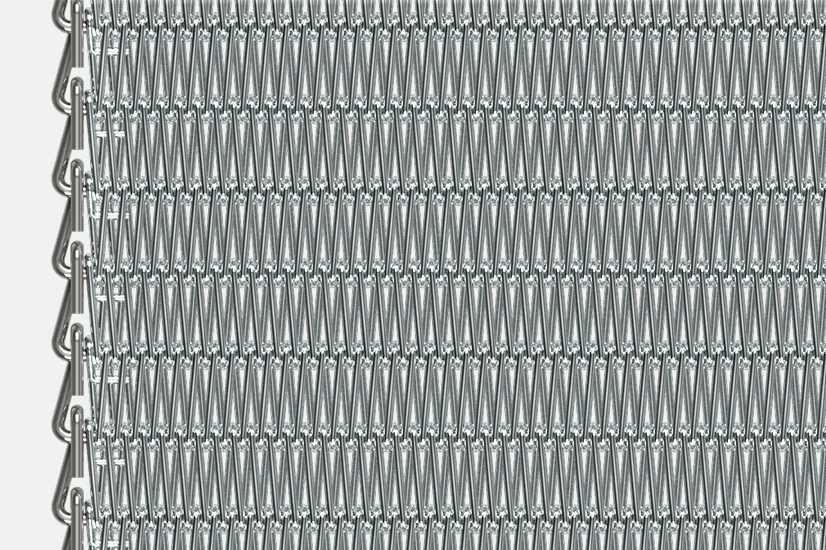 Le tapis transporteur VICO-TU se compose de spires à pas rapprochés, à torsion alternée (une à droite et une à gauche) et reliées par des tringles droites. Il est classé en fonction du pas et de l’ouverture interne des spires, du diamètre du fil des spires et de la tringle et du type de bordure.